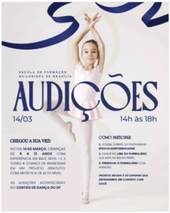 Uma grande oportunidade para jovens talentos da dança está chegando ao Distrito Federal. A Escola de Formação de Bailarinos de Brasília realizará audições no próximo dia 14 de março, das 14h às 18h, no Centro de Dança do DF, com o objetivo de selecionar novos alunos para um projeto gratuito de formação em balé clássico.